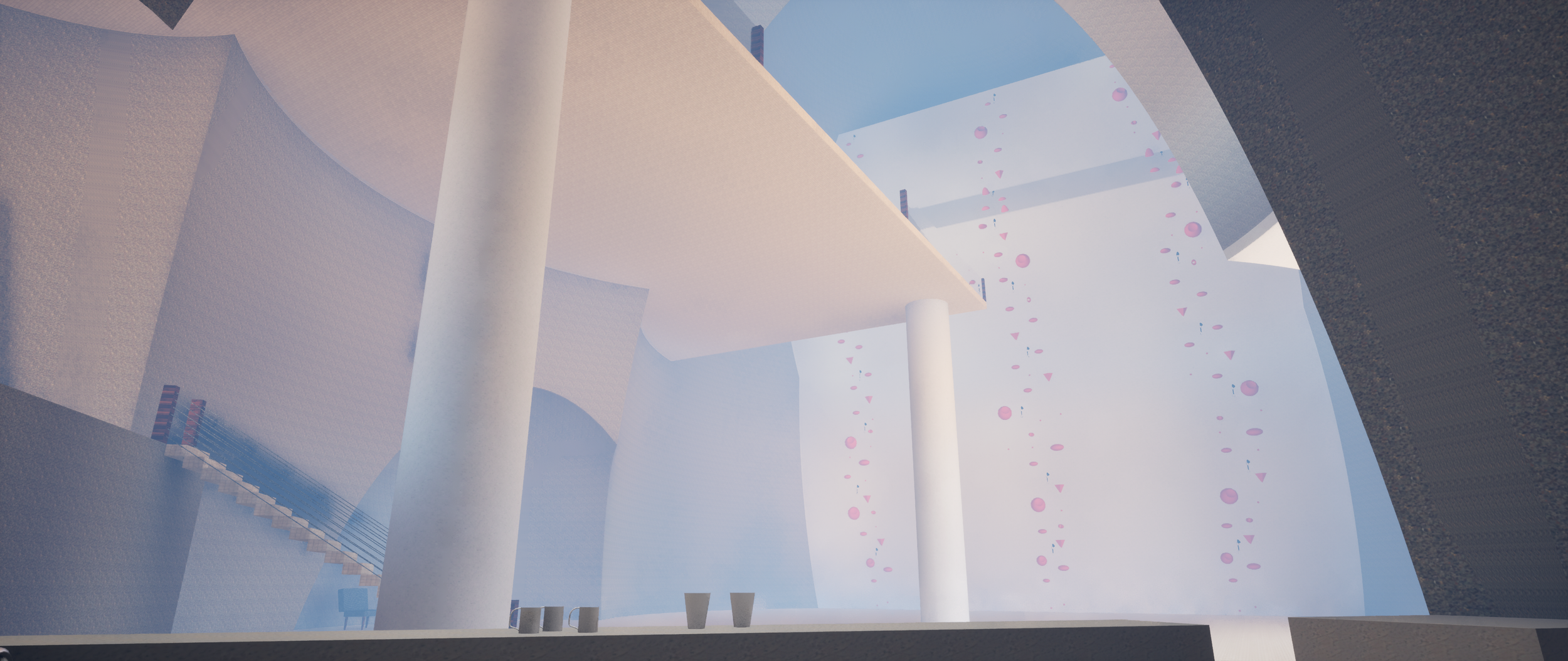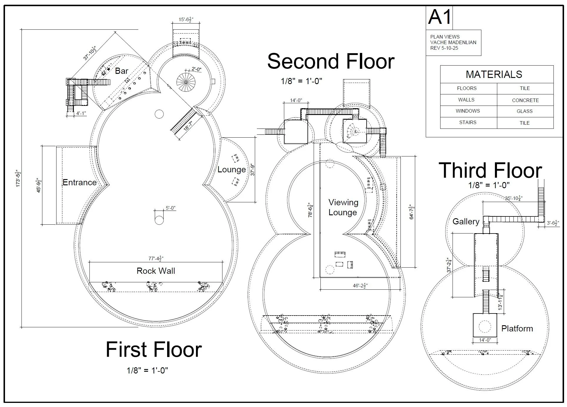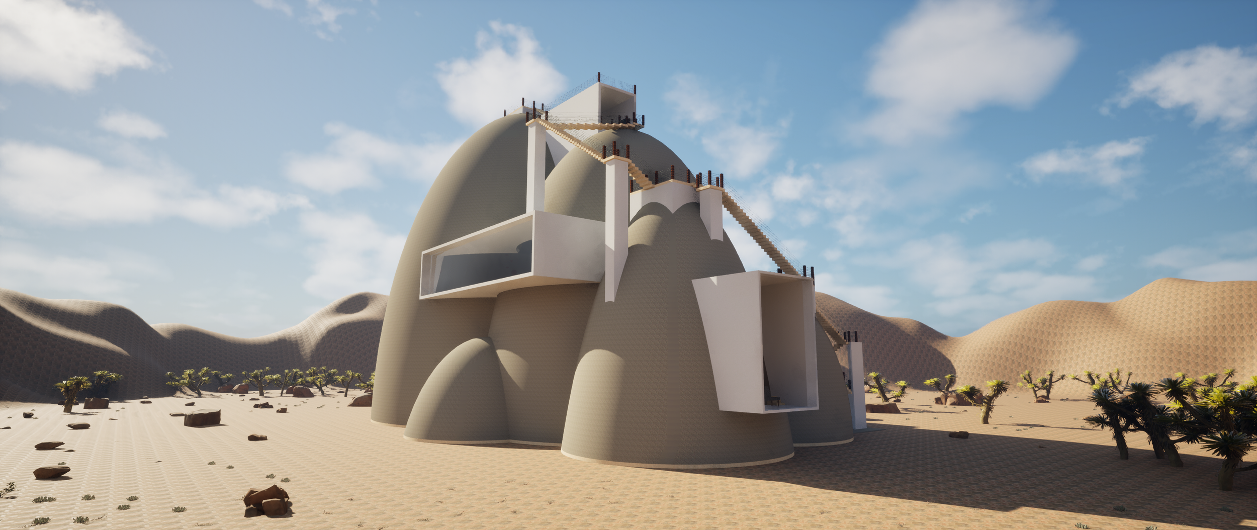 As part of the final design, I added furniture, some appliances and wall art to enhance spatial realism. Technical drawings were prepared for various elements, and my own artwork was showcased in an upstairs art gallery. A final virtual tour in Unreal Engine provides the viewer with a walking tour through this fun yet sophisticated building in a beautiful outdoor desert landscape.