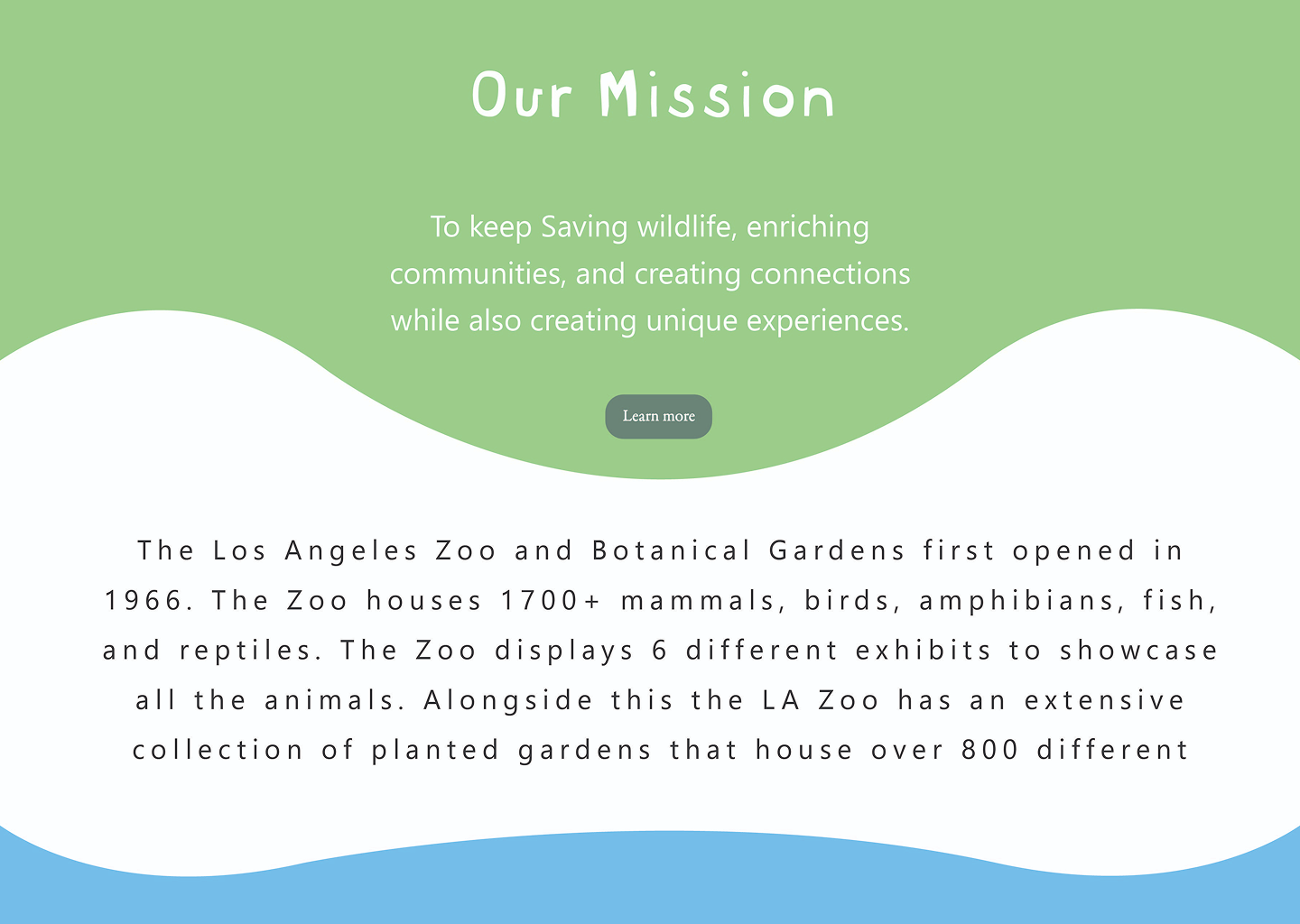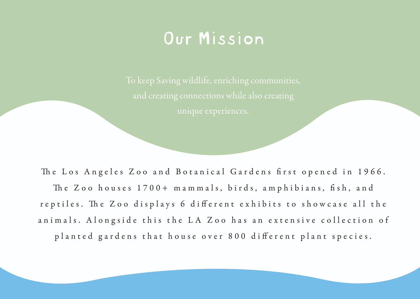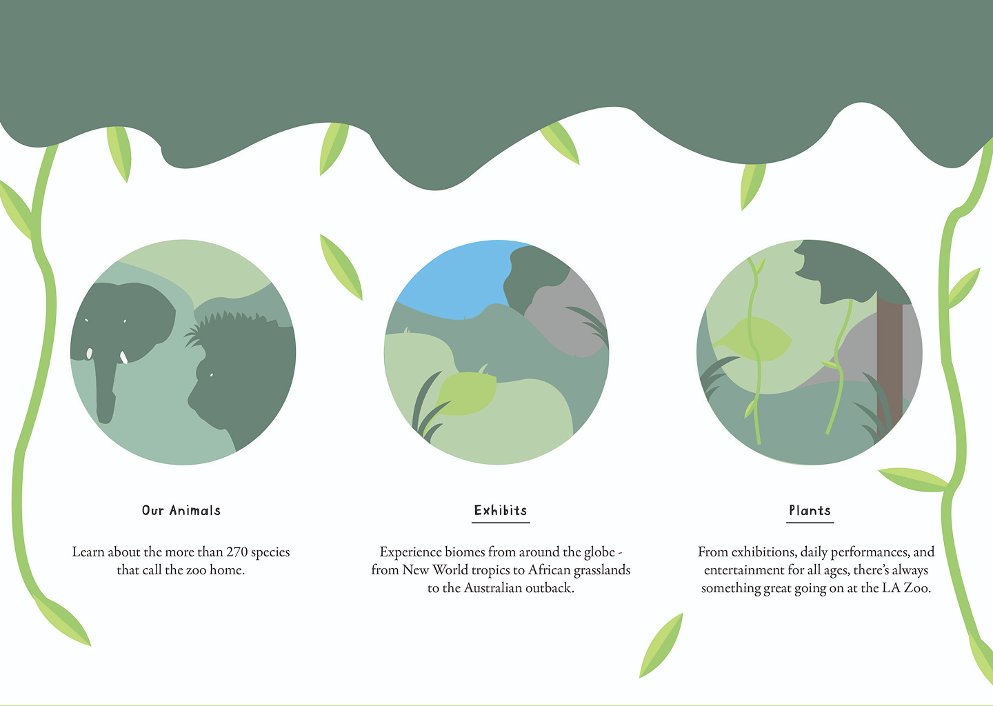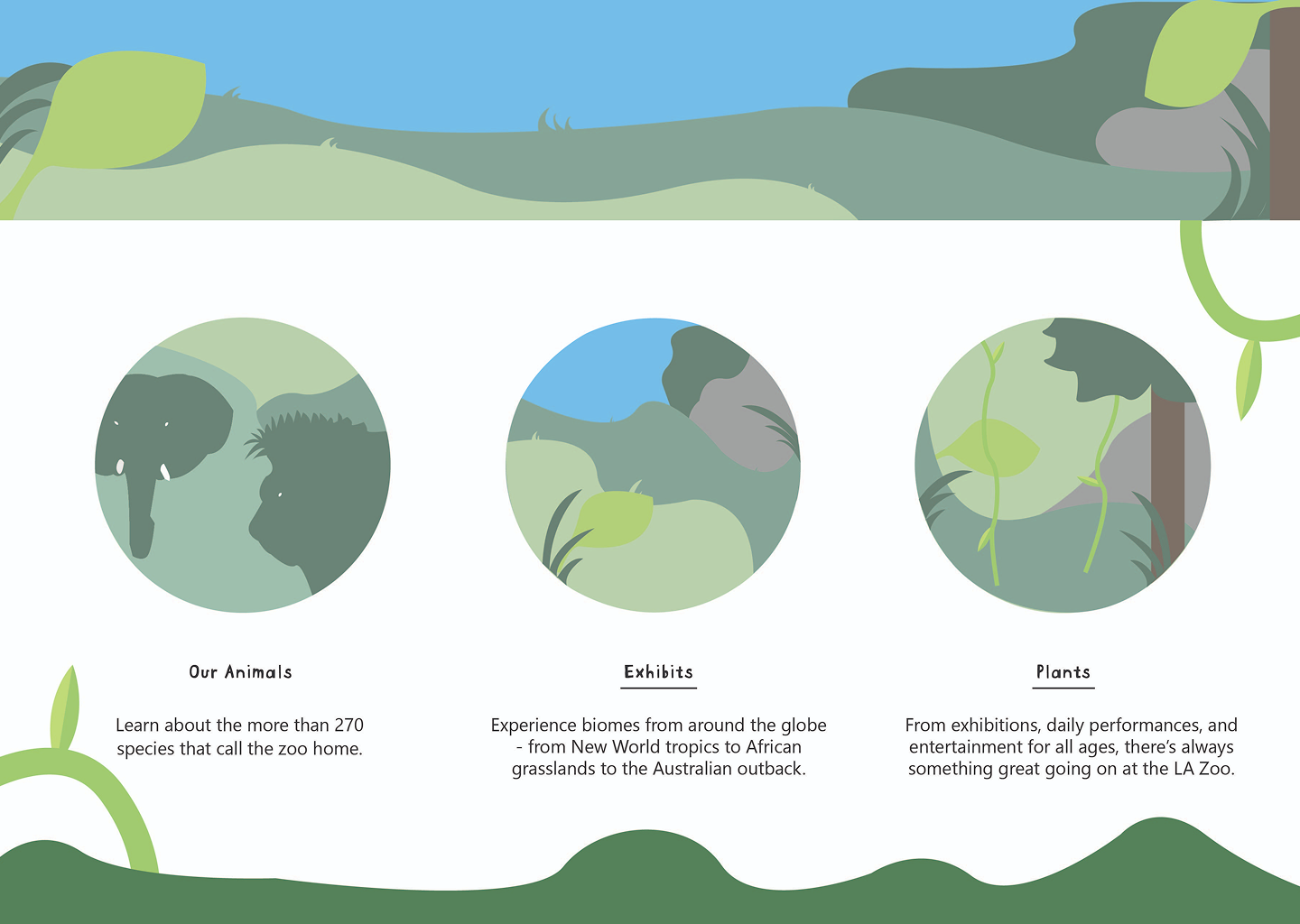 This class project involved a redesign of the Los Angeles Zoo website. As part of this project, it was important to understand the LA Zoo Mission and Vision statements along with the participant demographic. As many activities and events are geared toward children, it was important to establish a playful appeal. In researching other sites, I decided to incorporate not only animal images but also their habitat. In the initial drafts, some of the animals were created as silhouettes to add a hide and seek element to the visuals.